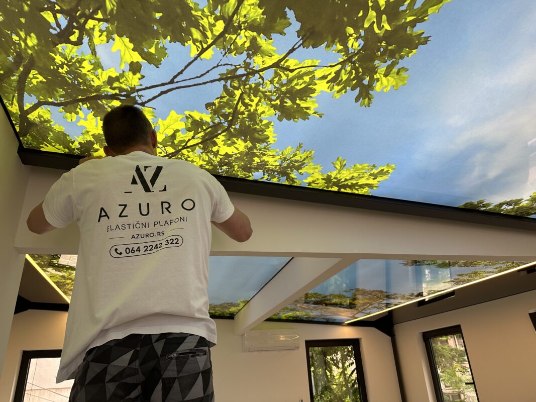 Kada su profili i instalacije pripremljeni, započinje ključna faza ugradnje – postavljanje elastičnog plafona od vinilnog platna, koji predstavlja završnu, vidljivu površinu.
