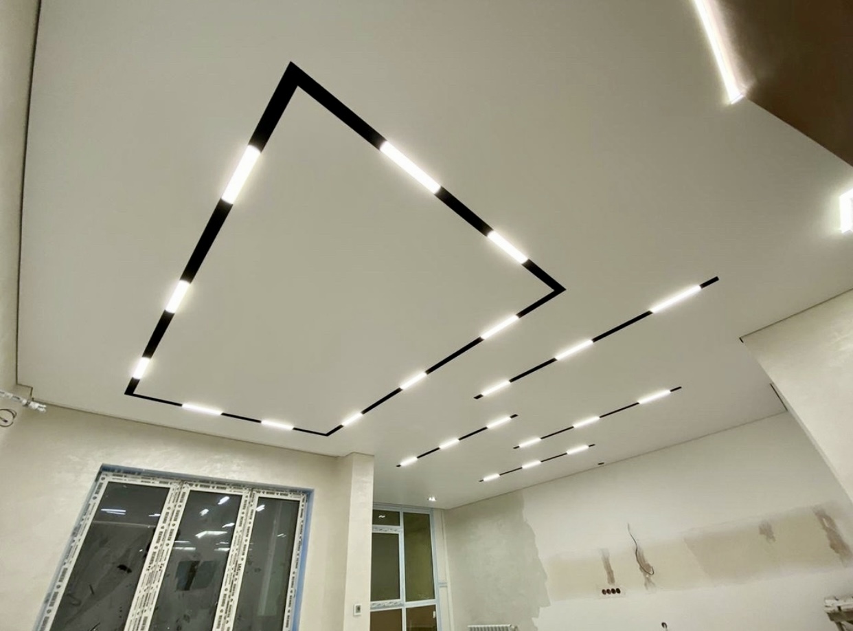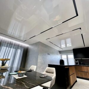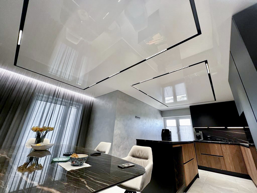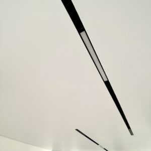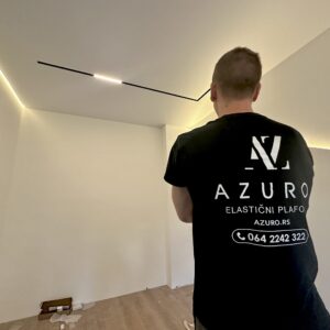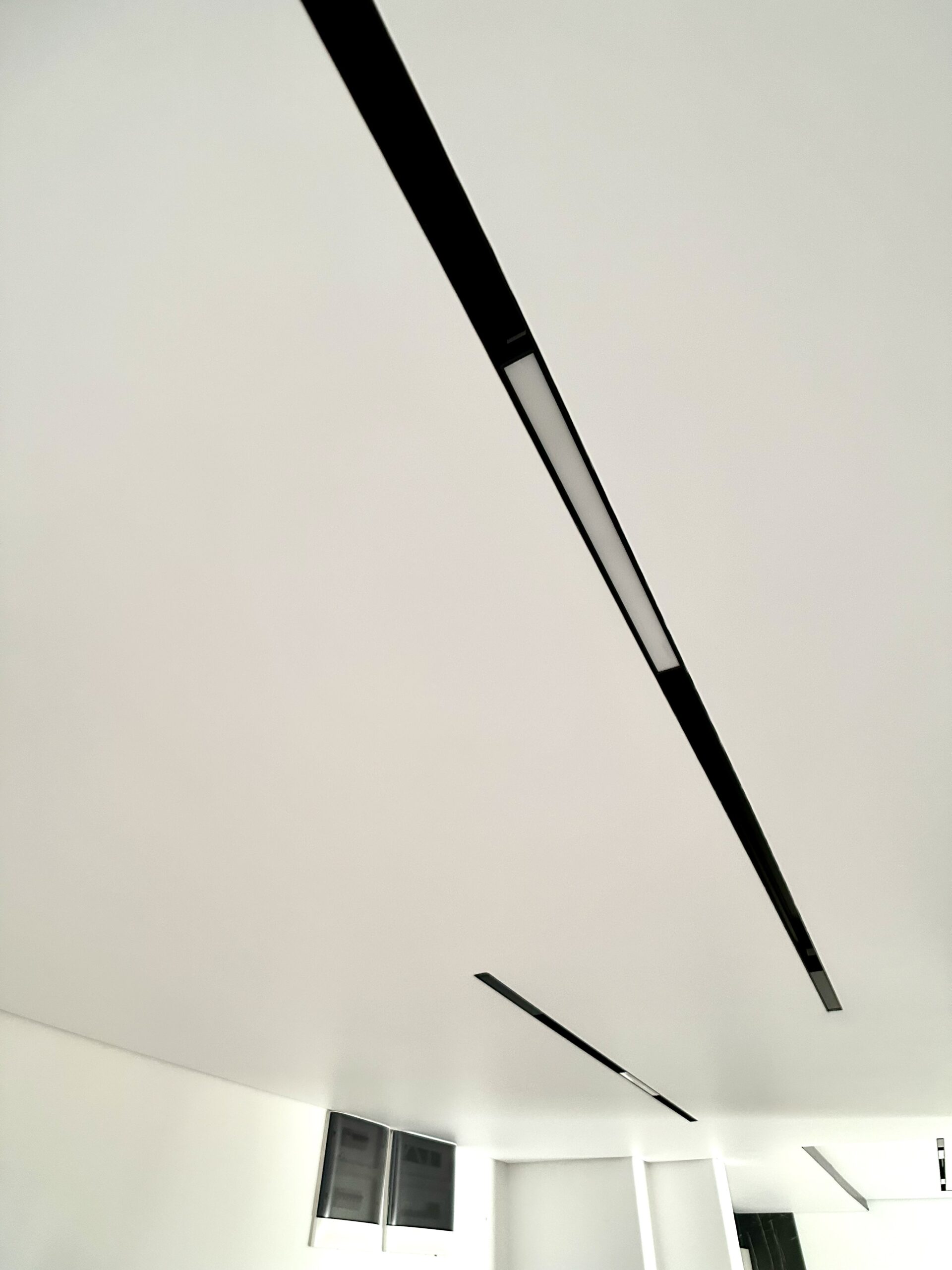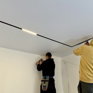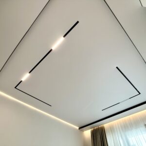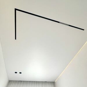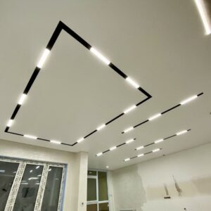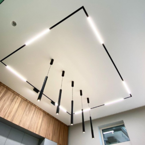 Plafon sa magnetnim šinama integriše savremeni sistem rasvete u plafonsku ravninu, omogućavajući fleksibilno pozicioniranje i promenu svetlosnih elemenata. Rešenje spaja plafon i rasvetu u jedinstven dizajnerski sistem.