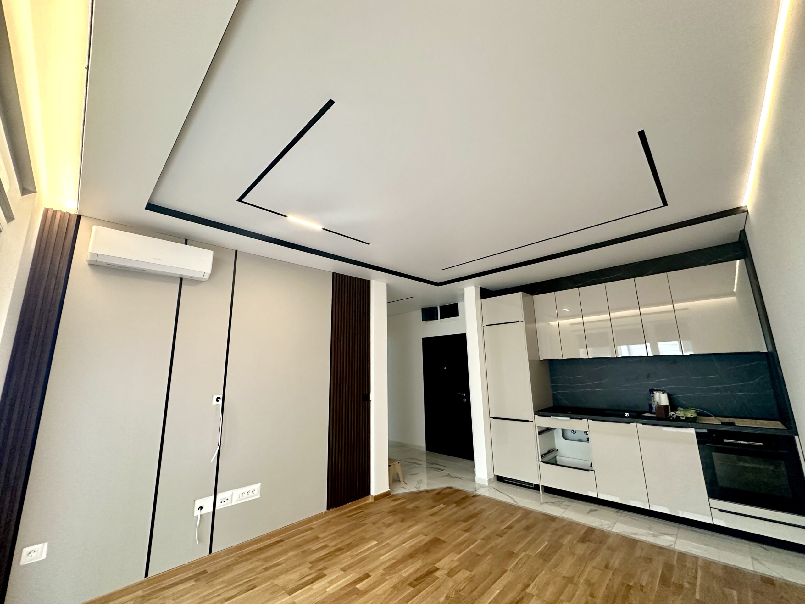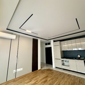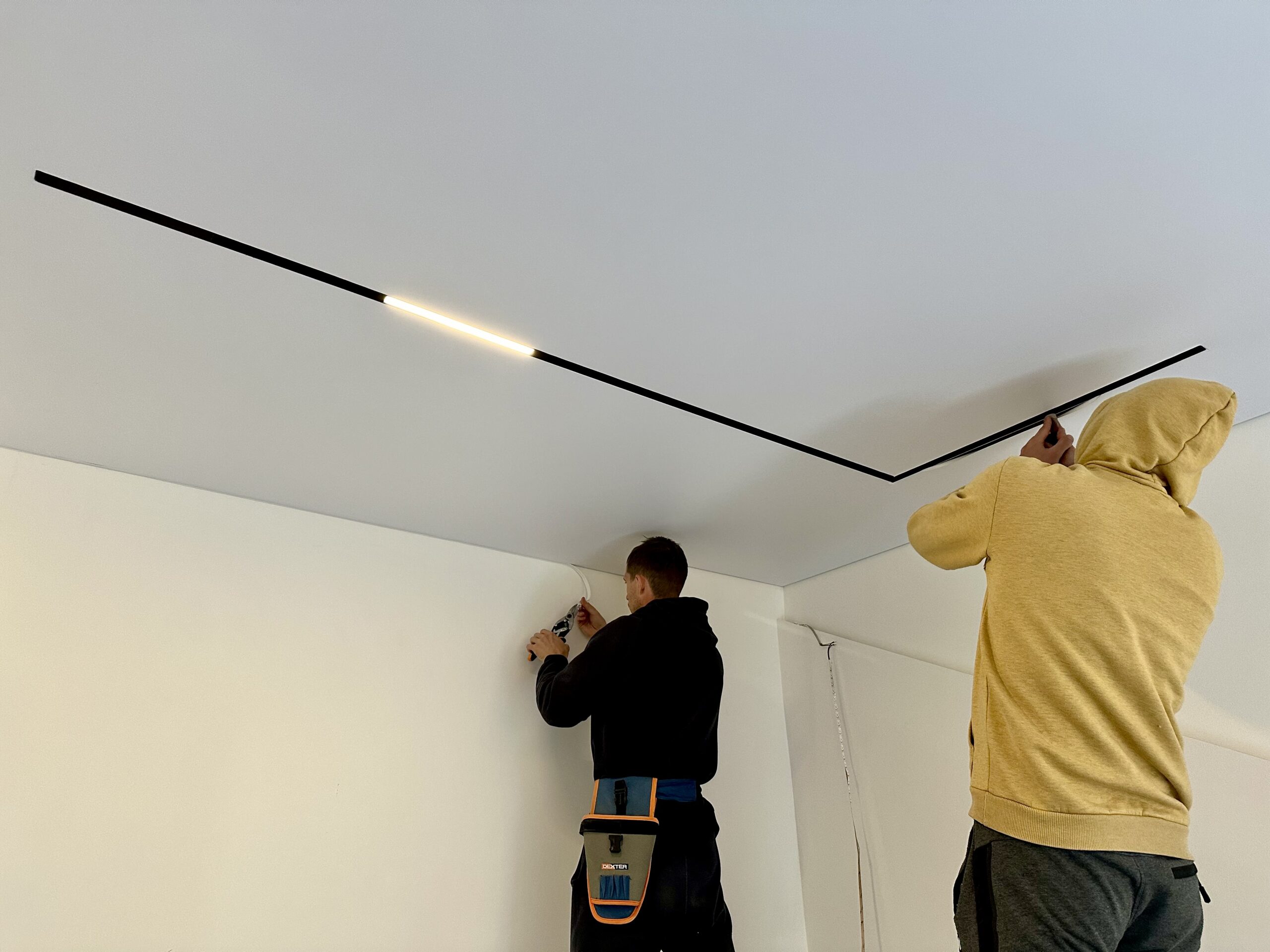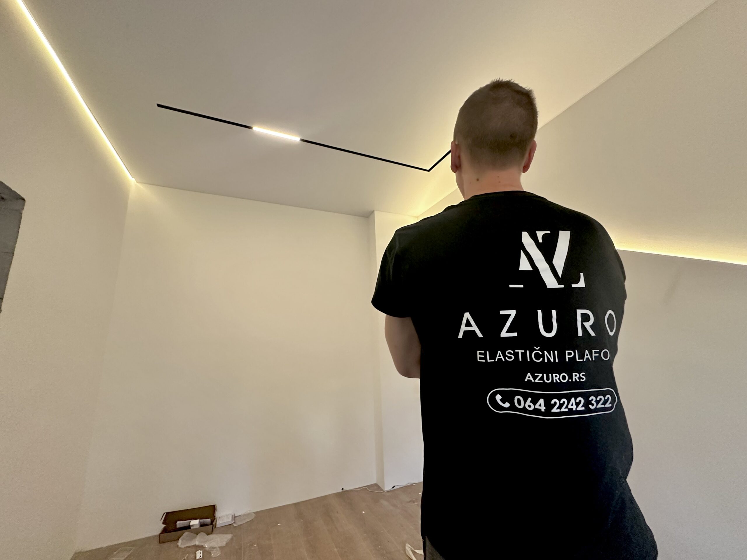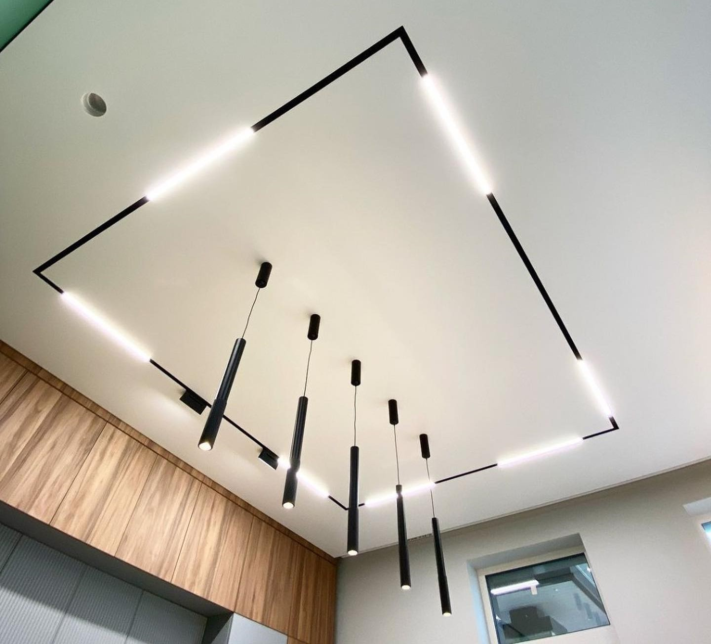 Plafon sa magnetnim šinama integriše savremeni sistem rasvete u plafonsku ravninu, omogućavajući fleksibilno pozicioniranje i promenu svetlosnih elemenata. Rešenje spaja plafon i rasvetu u jedinstven dizajnerski sistem.